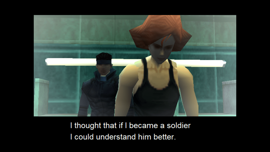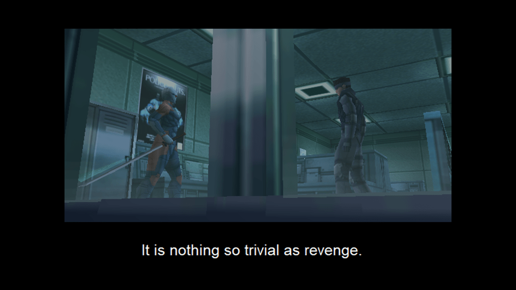 The narrative follows an episodic structure. There are no “levels” in MGS, and you can backtrack all you like, but acts of the story end with a boss fight where you win a key that unlocks new doors. Your narrative gift is is a flashback scene that explains the boss’ motivations, just like in so many battle-based anime. It’s a well-used trope that helps build empathy with the character you just shot to death.