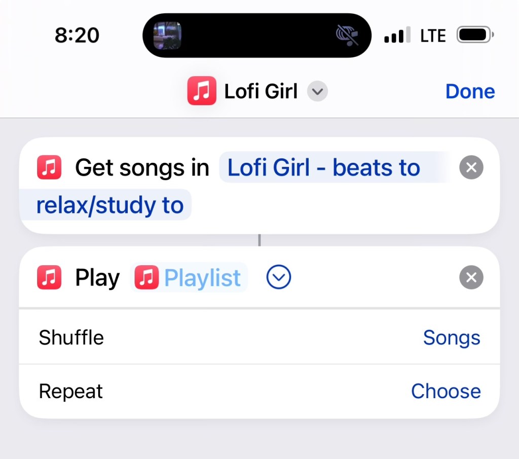 I build a two-step shortcut that shuffles tracks from Apple Music’s Lofi Girl playlist. I’d use Spotify but Spots doesn’t work with Apple’s shortcut system.
