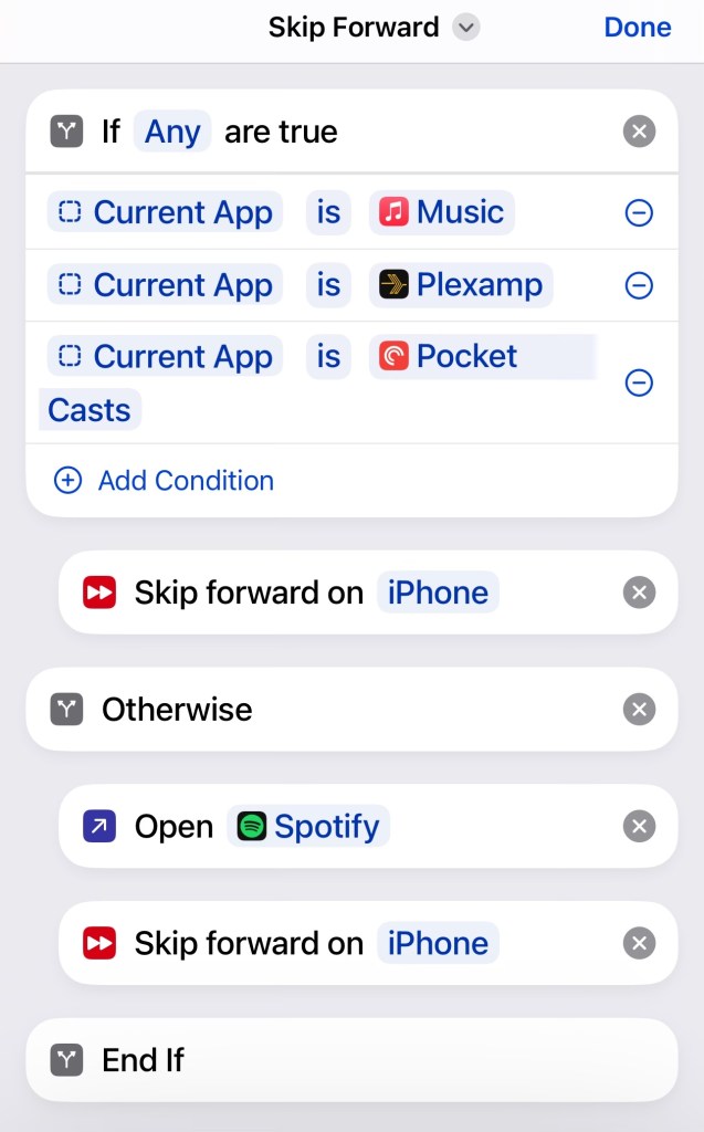 One problem with it is that Spotify won’t go to a next track unless the app is open, so I had to make an exception for it in the form of an if/then statement.