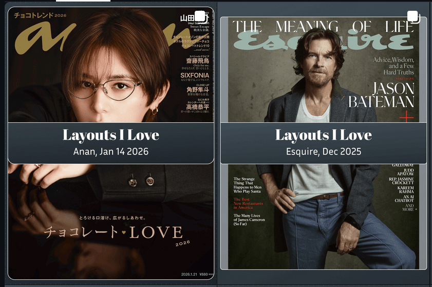I began a new social media project on January 1, 2026 called Layouts I Love. After working on it for a month, here are some things I’ve learned, and some of the reasons for my decisions.