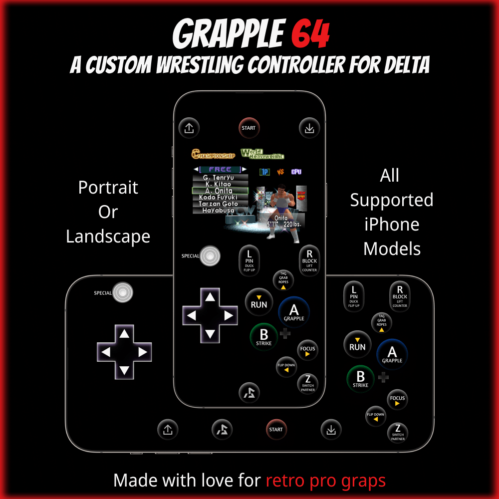 Grapple 64: A reworked N64 controller for wrestling games, featuring prominent D-pad, smaller analogue stick, custom button labels, and arcade-style layout for ease of use.